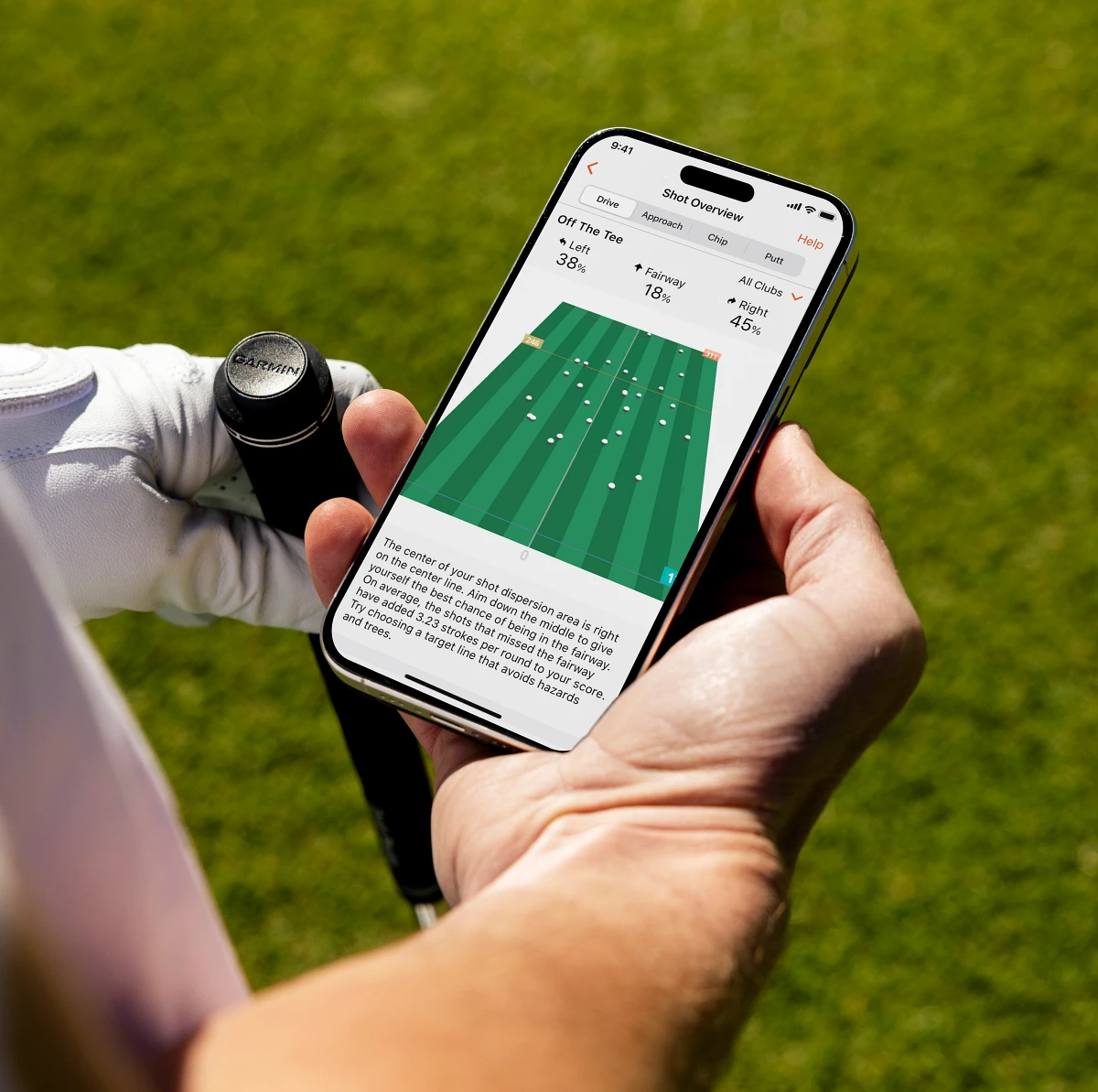 Po zakończeniu rundy, skorzystaj z aplikacji Garmin Golf1, aby zobaczyć analizę uzyskanych uderzeń dla każdej części gry, a ponadto przejrzeć uderzenia drive, approach, chip i putt.