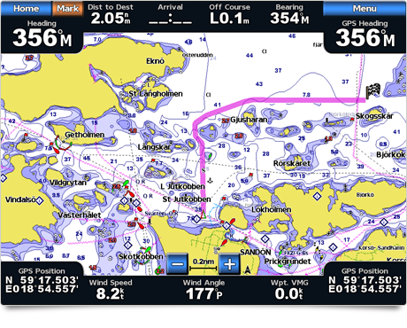Wystarczy podać lokalizację, do której chcesz się udać, a opatentowana funkcja automatycznej nawigacji firmy Garmin natychmiast przeszuka odpowiednie mapy w celu wyznaczenia na wyświetlaczu bezpiecznej wirtualnej drogi z ominięciem niskich mostków, płycizn i innych przeszkód na trasie.