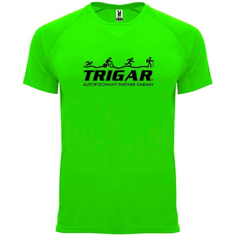 Koszulka techniczna z krótkim, raglanowym rękawem. Kolor zielony z czarnym napisem "TRIGAR Autoryzowany Partner Garmin" od frontu.