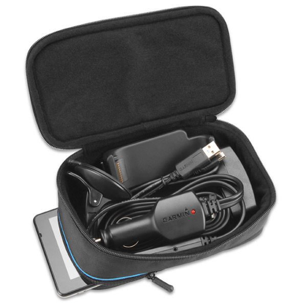 Etui jest wykonane z wytrzymałego, nylonowego materiału i ma 2 wyściełane przegródki zamykane na zamek. W jednej z przegródek etui można schować urządzenie nüvi z ekranem o przekątnej 3,5", 4,3" lub 5,0", a w drugiej przewody i uchwyt, dzięki czemu urządzenie będzie chronione przed zarysowaniem.