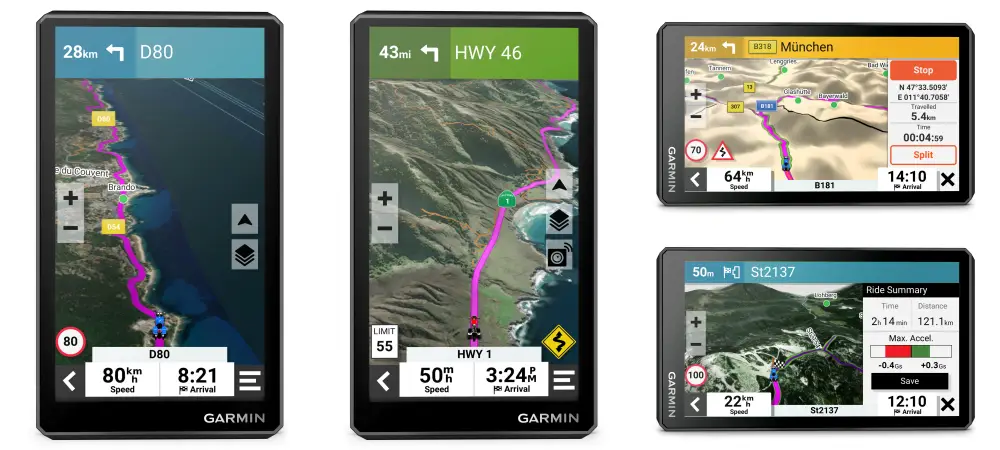Nowe rozwiązania idą o krok dalej. W serii Zumo XT3 pojawia się wskaźnik kąta pochylenia. Dane wyświetlają się na żywo podczas jazdy. Kierowca może obserwować zachowanie motocykla w zakręcie, aby lepiej analizować własną technikę. To funkcja przydatna zarówno w dynamicznej jeździe po górskich drogach, jak i podczas treningu na torze.